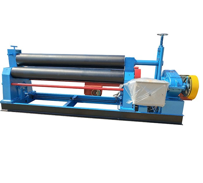 該機結構型式為三輥對稱式,上輥在兩下輥中間對稱位置作垂直升降運動,通過絲桿絲母蝸桿傳動而獲得,兩下輥作旋轉運動,通過減速機的輸出齒輪與下輥齒輪嚙合,為卷制板材提供扭矩。